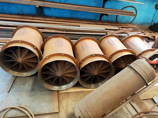 1)jk58轴流风机使用外包双消声器的组合。该系列风扇由8个管件构成,包括一个集电器,一个整流罩,一个进气消声器,一个狂风暴雨马达,一级叶轮,一个排气消声器和一个扩散消声器。